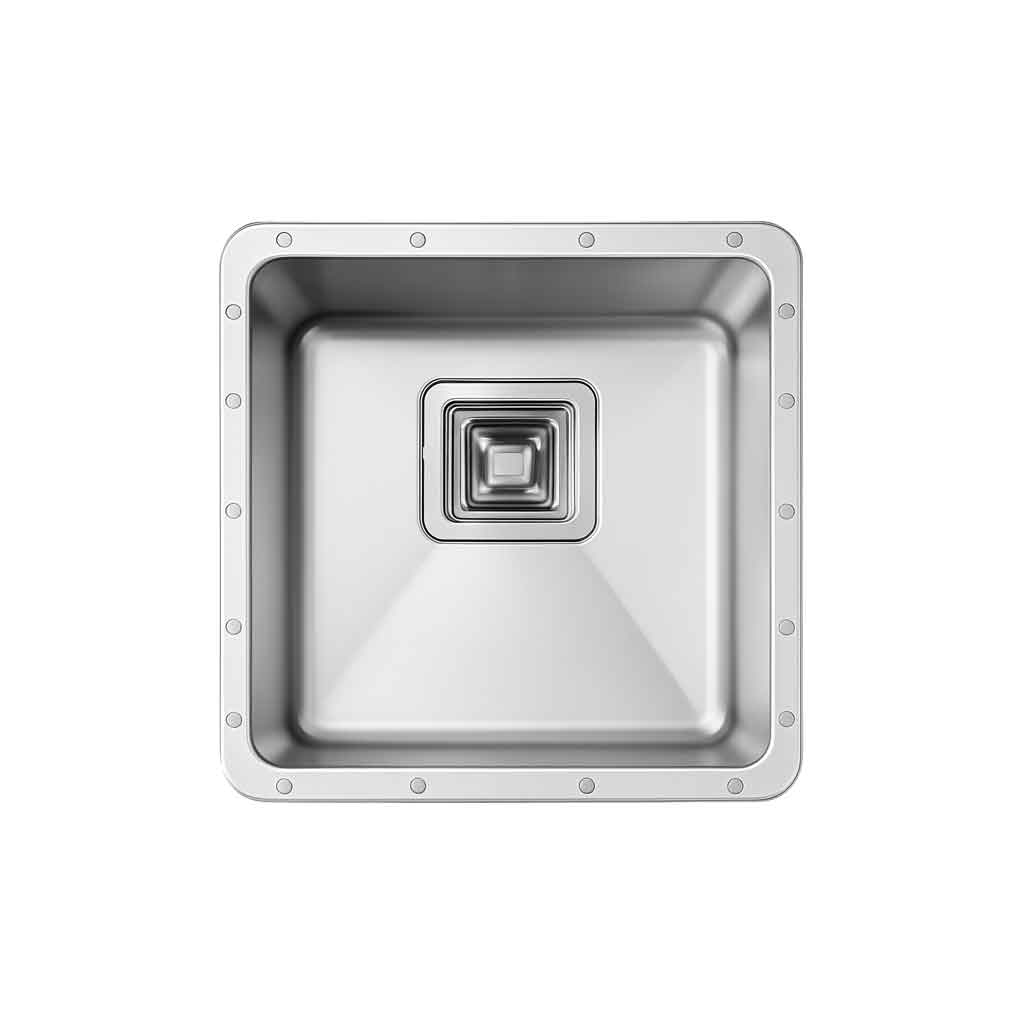سینک زیرکابینتی مدل 404 اخوان، دست ساز سری زیرکورینی (Under Counter)، مربعی شکل با ابعاد 34*34 با وجود لوازم جانبی مانند سبد میوه شور عمیق، تخته گوشت گوشه مثلثی، مناسب برای خانواده های دو نفره، ادارات یا سویییت ها است.